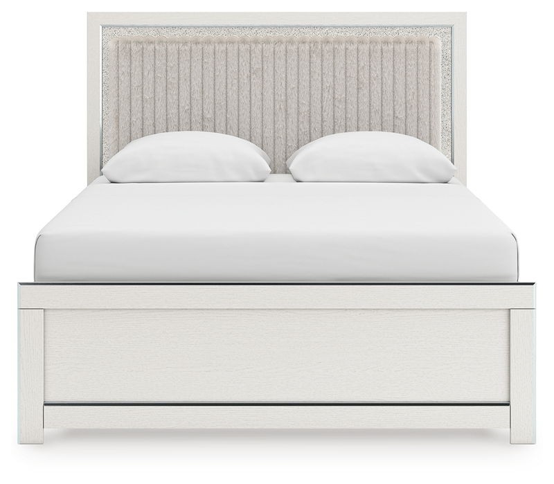 If glitz and glam are your jam, you’re gonna love this queen upholstered panel bed. Gleaming glitter and dazzling chrome-tone touches are paired with tufted gray faux fur for a stunning pop of pizzazz. Loaded with chic flair and serious sparkle, it's a simply splendid way to wake up your inner sanctum’s style.