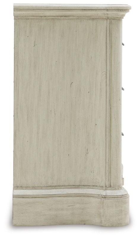 Add a touch of romance to your bedroom with this dresser. Its antiqued white painted finish and serpentine-shaped silhouette details are the picture of easy elegance. Drawers in multiple sizes offer ample storage space, while custom-designed bar pulls add originality.