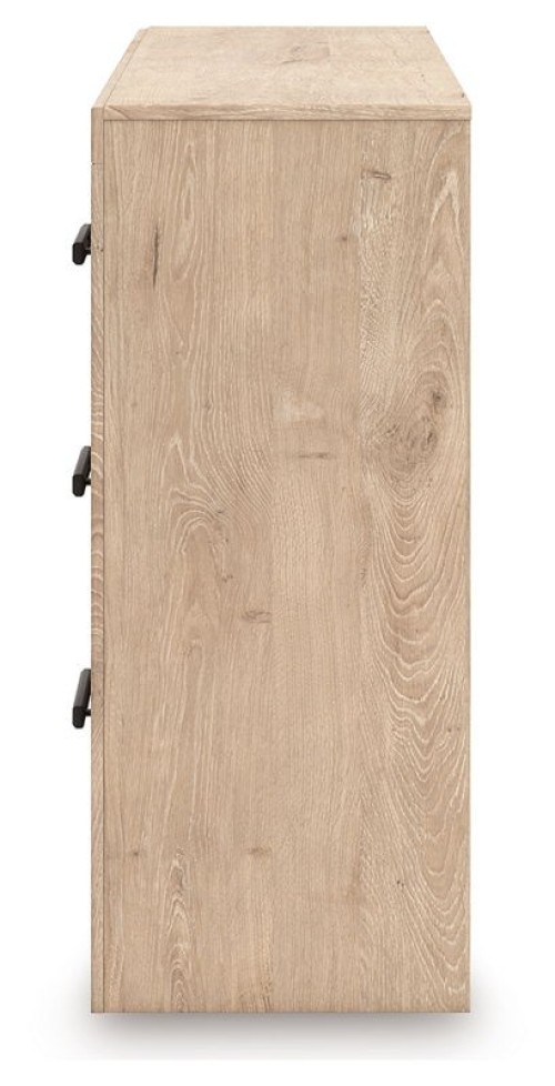 This dresser brings a touch of modern farmhouse charm to your home. Its light oak finish and clean lines have a fresh, airy feel, effortlessly creating an inviting atmosphere for a restful night’s sleep. Six spacious drawers with large black handles provide plenty of storage for all your nighttime essentials.