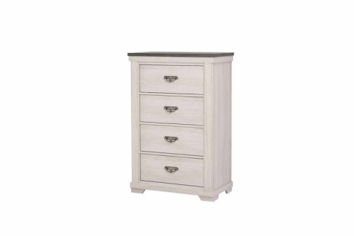 This bedroom set embodies a breezy, transitional style that harmonizes with any decor. The gracefully designed bed, with its panel headboard and soothing finish, invites a sense of calm and simplicity. Complementing the bed are the dresser and mirror, tall chest, and nightstand, each exhibiting a clean-lined structure and finished in a gentle hue that mimics the soft touch of morning fog. Classic hardware accents provide an understated elegance, while ample storage space in each piece ensures practicality meets sophistication.