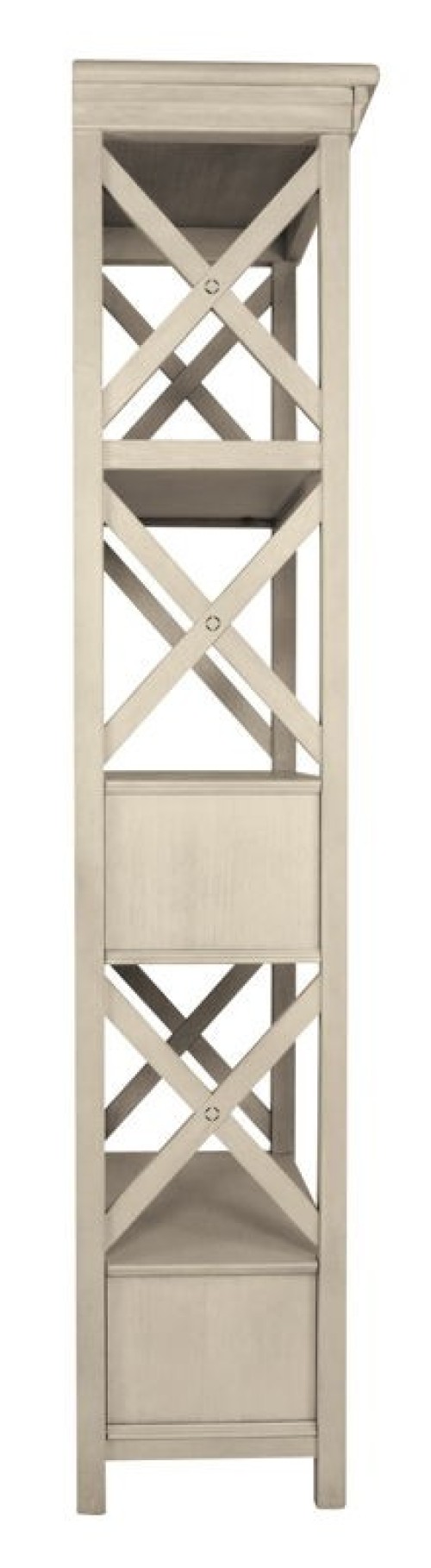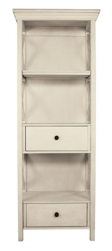 Need a stylish space to showcase dinnerware, pictures, decorations and more? This tall three-shelf display cabinet is a dream come true. The textured antiqued white finish provides a perfect backdrop for presentation. For the items you want to hide, there are two deep drawers. Embellished with the casual appeal of lattice sides, attractive crown moulding, clean lines and lightly distressed finish, this cottage-style shelf provides ample storage in such an artful way.