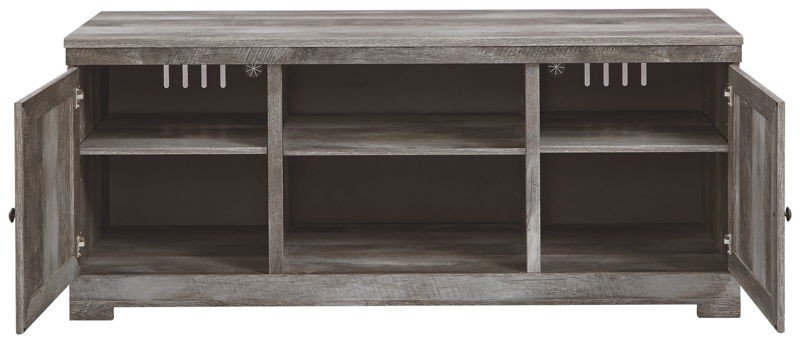 This TV stand is sure to win your heart with its daring take on modern rustic design. Its crisp, clean minimalist-chic profile is enriched with a striking replicated oak grain, thick plank styling and a rustic gray finish for that much more authentic character. Crossbuck detailing adds a brilliant barn door inspired touch. Opt for the optional fireplace insert (sold separately) for added warmth.