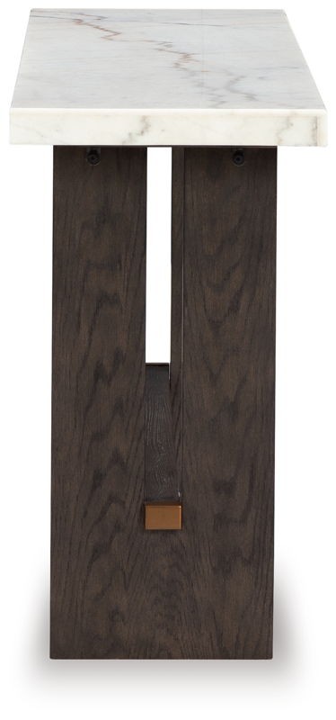 Dressed to thrill, this simply stunning sofa table offers a high-design look at a down-to-earth price. Ultra-sleek lines are accentuated with a dark waxy brown oak finish that’s so easy on the eyes. Clean-lined and modern, the plinth base and natural marble tabletop showcase quality craftsmanship and attention to detail. This table is the perfect sofa companion for a living room or family space, with a timeless look that's made to last.