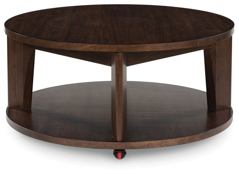 It's hard to say what's most striking about this round coffee table. Is it the rich warm brown finish or the thick tapered legs? Either way, the table's clean, contemporary aesthetic is perfect for your casual lifestyle. Casters let you roll the coffee table wherever you please … maybe next to your couch or loveseat.