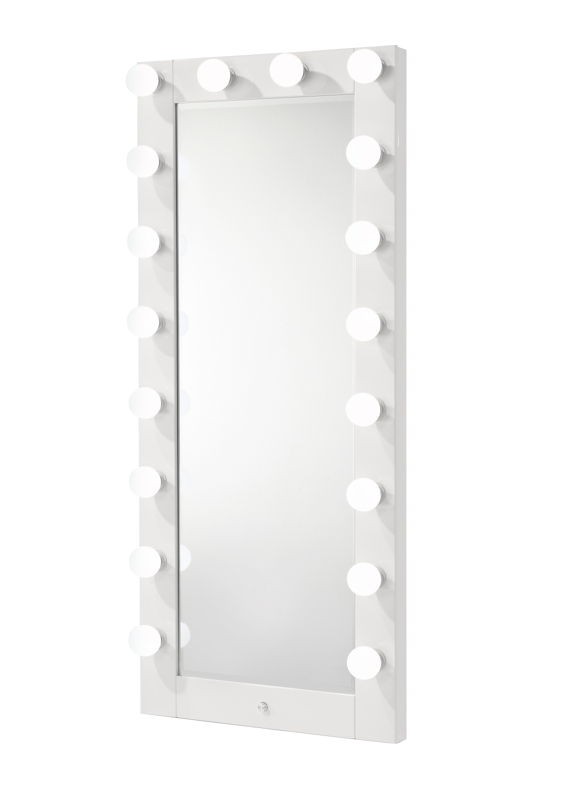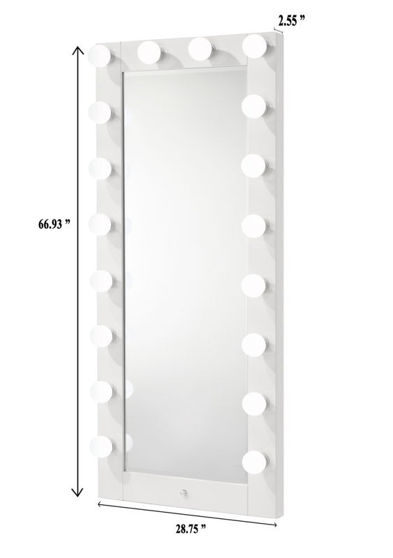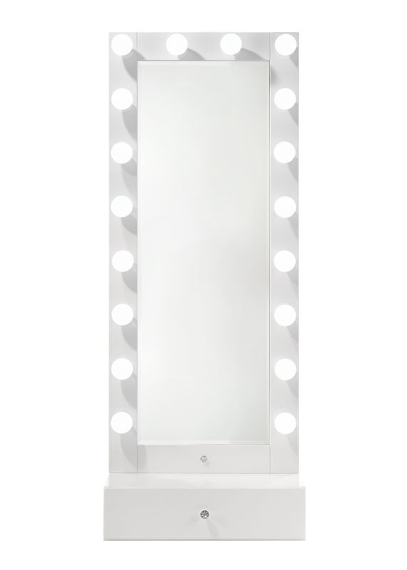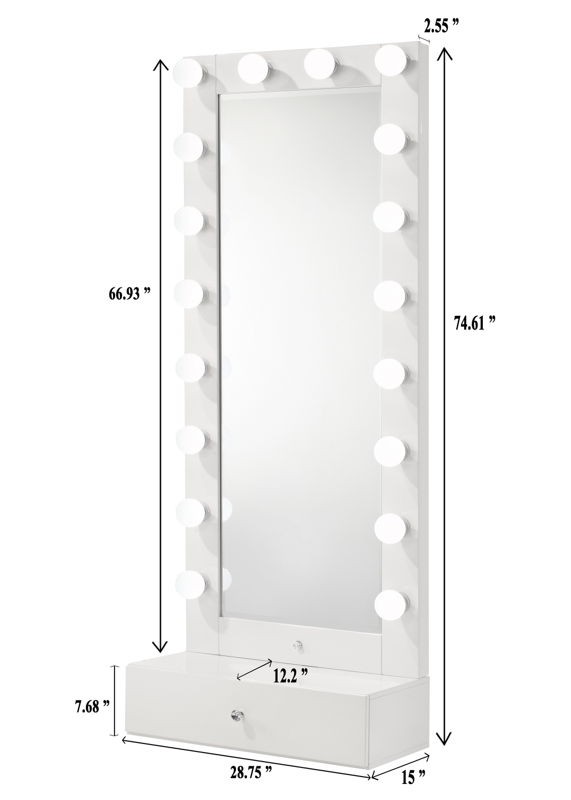 Step into a world of glamour with this sleek and chic vanity set, a perfect fusion of functionality and fashion. Its glossy white finish and clean lines are complemented by the sparkle of a crystal-like knob, adding a touch of sophistication to your personal space. The full length mirror is surrounded by radiant lights, while the ample drawer provides storage for essentials. A perfect spot to check your outfit of the day.